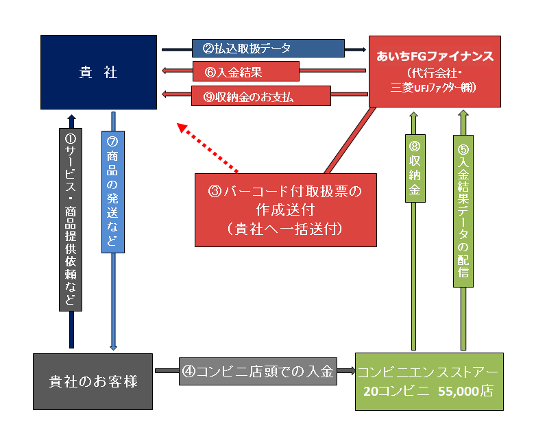 貴社から、あいちFGファイナンス宛にコンビニでの払込票の作成データをいただきます。